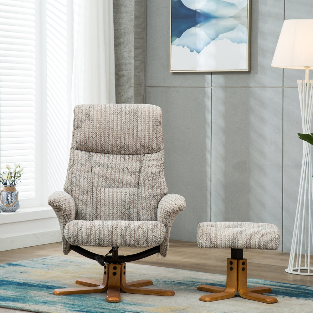 An excellent value swivel recliner chair upholstered in 6 stunning fabric and leather match finishes.