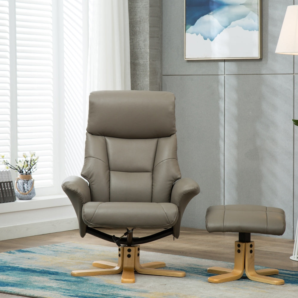 This great value recliner comes complete with a specially-designed sloping footstool, allowing you to rest your feet and legs at the optimum height. Both the chair and the footstool are upholstered in fabric or quality leather match and supported by an elegant, cherry-coloured base.